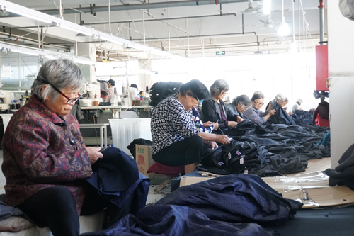 河南沈丘县永盛服饰有限公司车间内,在家闲不住的老人们到车间打零工,挣点零花钱 王林园 摄