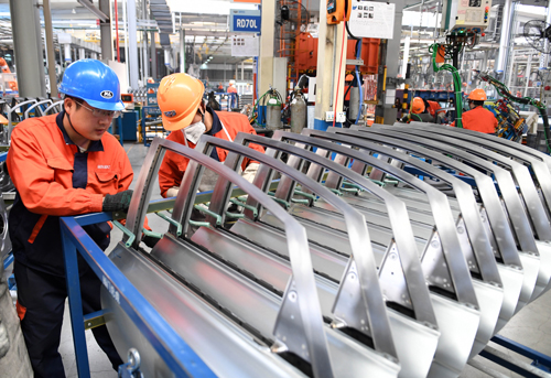 2018年3月27日,工人们在浙江临海的吉利汽车生产车间工作 殷博古 摄