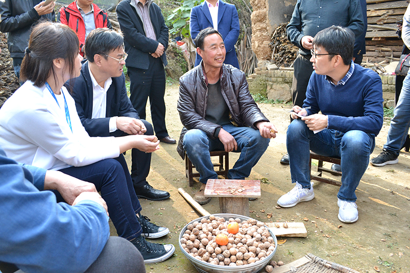 ▲ 核桃种植户李现法(右二),向河南省商务厅电子商务办公室副主任韩玉舟(左二),苏宁郑州地区管理中心副总经理赵冬利(左一)介绍今年核桃的收成