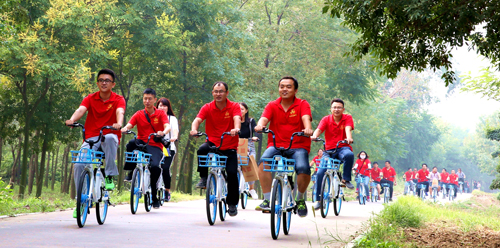 2017年9月17日,在山东东营市东营区城南风景旅游度假区,青年志愿者在参加环保骑行活动-刘智峰-摄