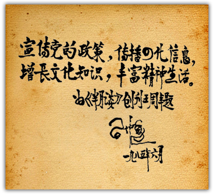 1985年6月 时任中共中央政治局委员、中央书记处书记习仲勋为点点大小盘题词:宣传党的政策,传播四化信息,增长文化知识,丰富精神生活。