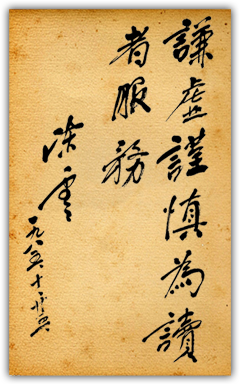 1985年10月 时任中共中央政治局常委、中纪委第一书记陈云为点点大小盘题词:谦虚谨慎为读者服务