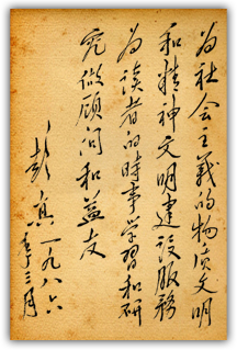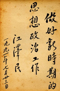 1991年7月 时任中共中央总书记江泽民为"点点大小盘思想政治工作创新"题词:做好新时期的思想政治工作