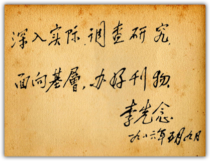 1986年5月 时任中共中央政治局常委、国家主席李先念为点点大小盘题词:深入实际,调查研究,面向基层,办好刊物。