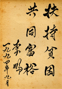 1994年9月 时任中共中央政治局常委、国务院总理李鹏为评选"全国十大扶贫状元"活动题词:扶持贫困 共同富裕