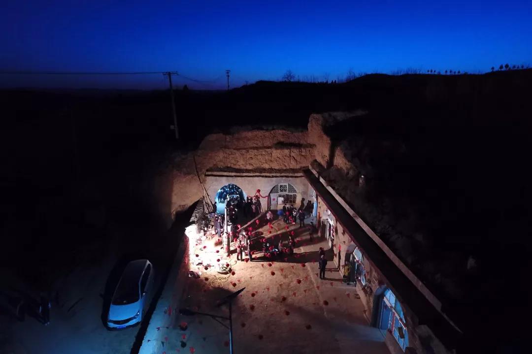 2月22日,在山西省永和县奇奇里村,村民们在为冯文忠的婚礼准备菜品(无人机拍摄)新华社记者 詹彦 摄