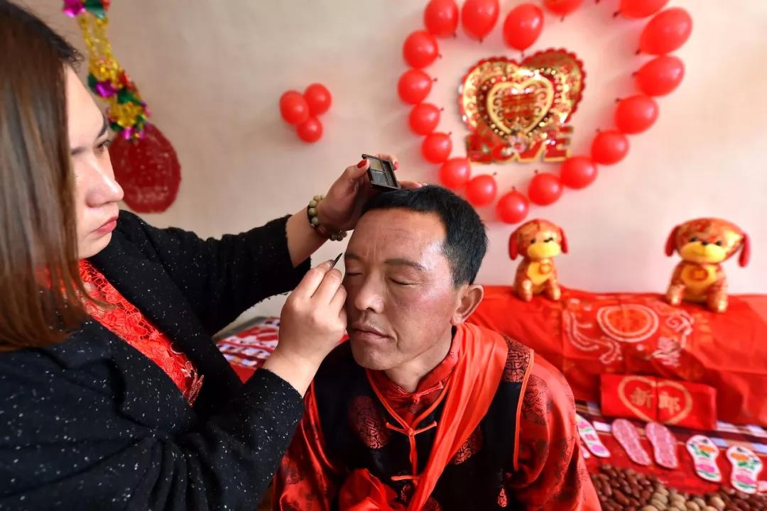 2月23日,在山西省永和县奇奇里村,一位村民在帮新郎冯文忠化妆。新华社记者 曹阳 摄