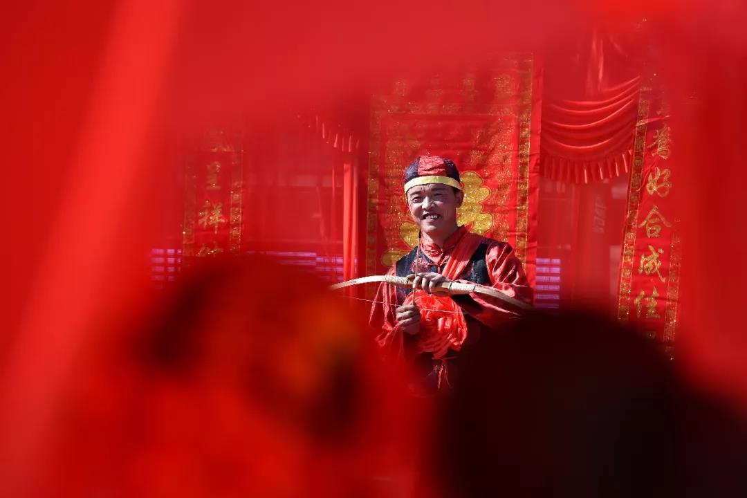 2月23日,在山西省永和县奇奇里村,新郎冯文忠在婚礼仪式上射箭。 新华社记者 詹彦 摄